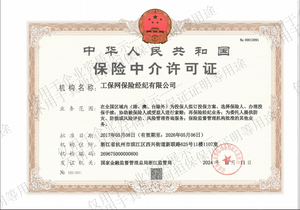 工保网保险经纪有限公司,成立于2016年5月20日,总部设在杭州。是经中国银行保险监督管理委员会批准开业的全国性、综合性保险经纪公司。公司注册资本人民币5000万元,以工程保证保险等工程类保险业务作为公司主营业务。作为全国保险经纪持牌机构,工保网垂直于建筑行业,打造国内专业化和智能化to B综合保险经纪服务创新平台,致力于成为国内建筑领域互联网保险经纪行业新生态的初创者与建设者。